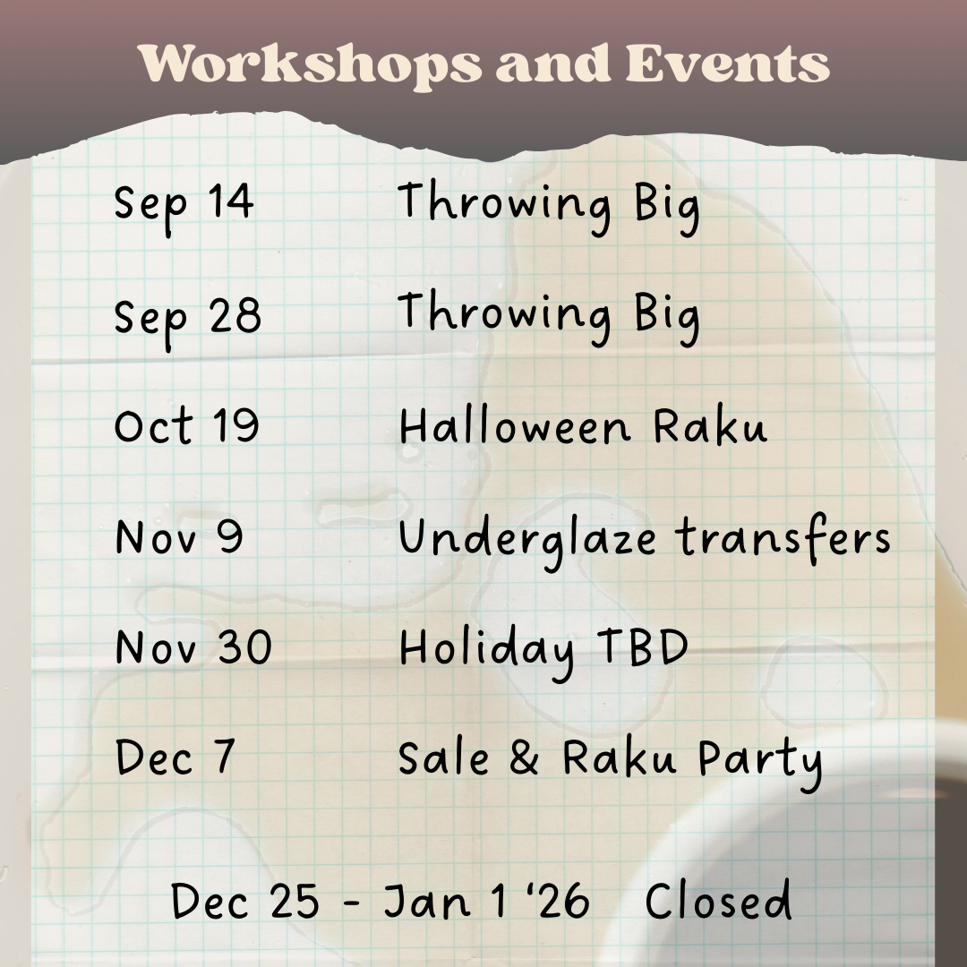 We asked and you answered. Throwing Big is our next workshop. Because it’s limited to 8 wheels, we have 2 different Sundays you can join us. Then there will be a Raku firing for Halloween, Underglaze Transfer workshop, and something yet to be decided for the end of November. Find any of those in the workshops tab as we release them. We’ll top the year off with a big holiday sale and another Raku party December 7th.